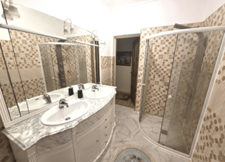 Magasföldszint 70 m2: 2 szoba, konyha, előtér, 2 fürdőszoba-WC, fedett terasz (étkező) 20 m2 és erkély 11 m2.